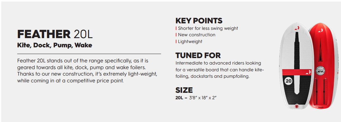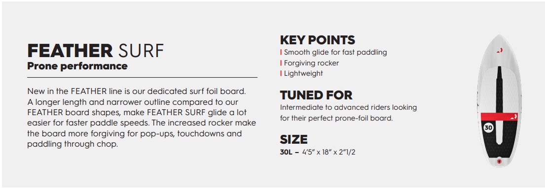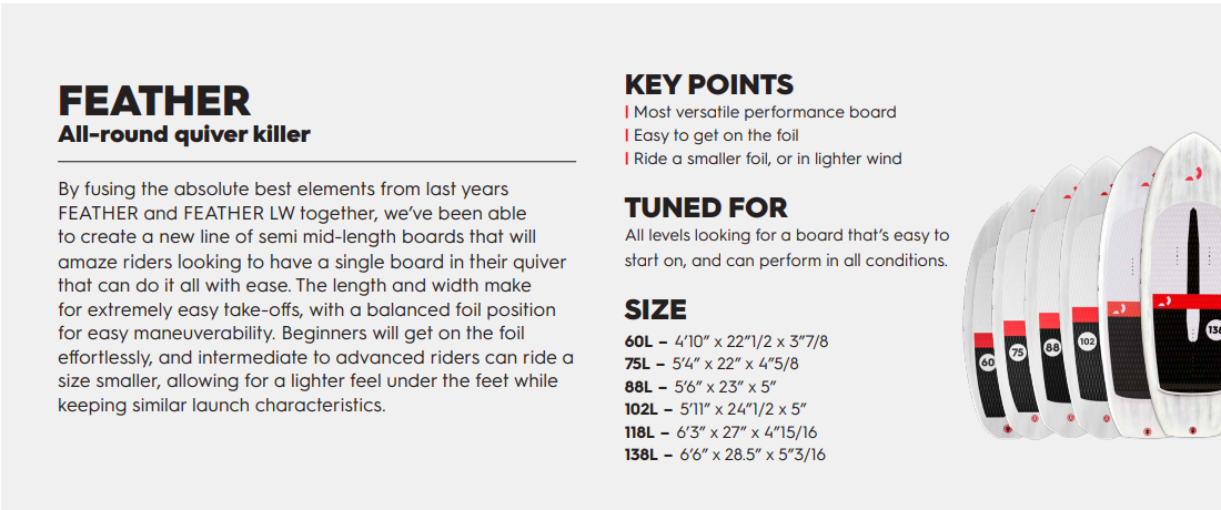 Feather boards have been designed with one simple objective: to be as easy and fun as possible. To achieve this goal we focused on keeping only the absolute minimum necessary on the board, while having as much volume as possible. You get the floatation for low speed starts while having minimal swing weight when riding for easy turns. We have also repositioned the foilboxes further forward, in order to have the rider very centered on the board,. This has two advantages: the balance position for pre-take off is the same as the riding position avoiding the need to readjust as the board is getting on foil. It also makes the overall board feel smaller with less inertia when turning because the length behind the back foot cancels the weight in front of the front foot. New for this year, we’ve made them longer and narrower to make take-offs much easier and more forgiving, while keeping it stable on the water. This shape makes it glide through the water easily, and the increased rocker makes it more forgiving on touchdowns and easier to ride in choppy conditions.