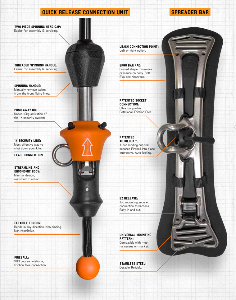 A - The Fireball is a ball and socket connection - frictionless, built from the ground up for kiters. The rotational axis allows for riding that’s easier both on your mind and soul.