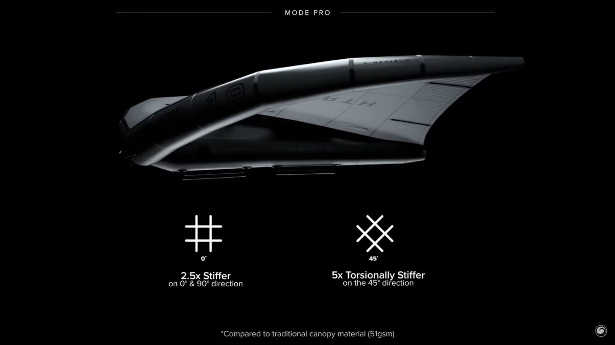 A stiff canopy equals performance. When you're riding powered, you want a canopy that's not going to stretch and elongate and warp. You want something very stiff and strong with a stiff frame to support that so you're not getting any weird shapes from the wing to decrease the efficiency of the wing or spill off power. This canopy definitely does that. It contributes to that poppy, snappy response that we feel with this wing, all the way through the range from light end up to seriously overpowered riding. You also get improved upwind performance and apparent wind generation. That is a key component of the upgraded performance of the Mode Pro.