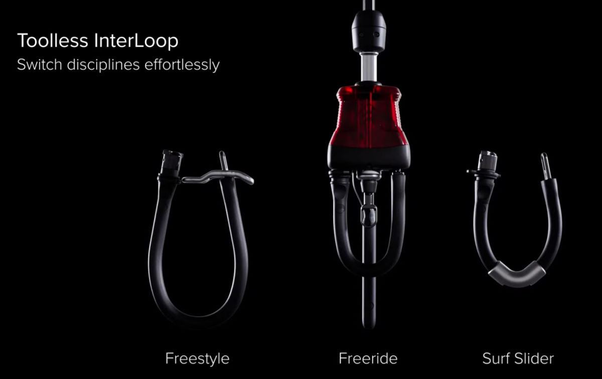 You can swap the loop for other riding disciplines without tools. Options include a surf slider and freestyle loop for unhooking.