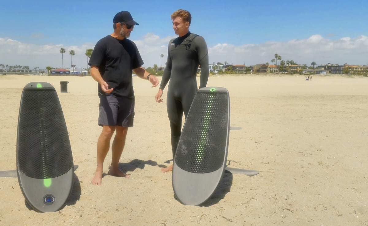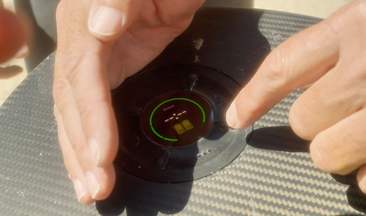 Cole: That's what I couldn't get over. Although you can customize it for your conditions and what you're doing, Chris just was like, "Hey, here's the settings you're going to use." And I hopped on and went and rode and it was so easy. You hit the circle button and you feel like Superman paddling out into the lineup. I think the boost button was set at an 8 with a two or three second acceleration, and the first wave I saw I hit the boost and got right up onto it. And it's such a smooth transition. As soon as you get up out of the water, the computer goes, "Okay, we're out of the water." And then the motor shuts off. And it's quiet. When you're paddling, you barely hear it. So yeah, it's super easy to use. Okay, let's chat about the foil. The other magical part.