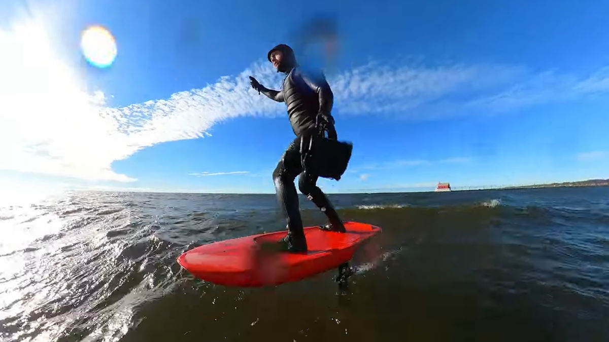 Cole: It's the weirdest thing; you think there'd be this moment where you get all this drag released when that unit comes out of the water, but you're just up and riding. Re-entering the water is a little bit different story. What I found is that when you want to put the Foil Drive back into the water, you want to make sure you do one of two things: you either start that propeller before you enter the water, or you start the propeller after you have that Foil Drive unit submerged completely underneath the water. If the propeller's halfway in and halfway out of the water, you're going to get this weird cavitation effect where the prop is hitting the water, but it's not, and it makes for a really unstable ride. That caused a lot of my falls to happen. Did you feel a similar way on that?