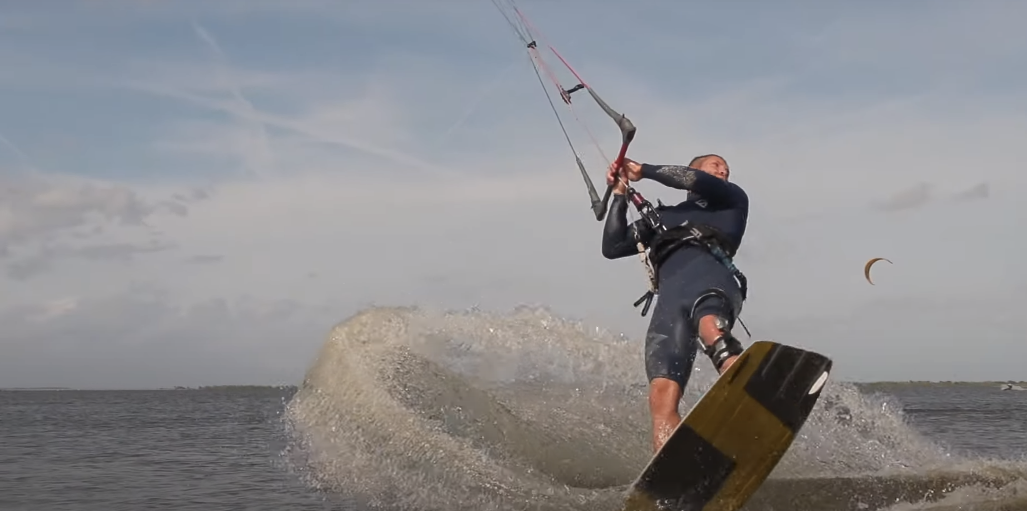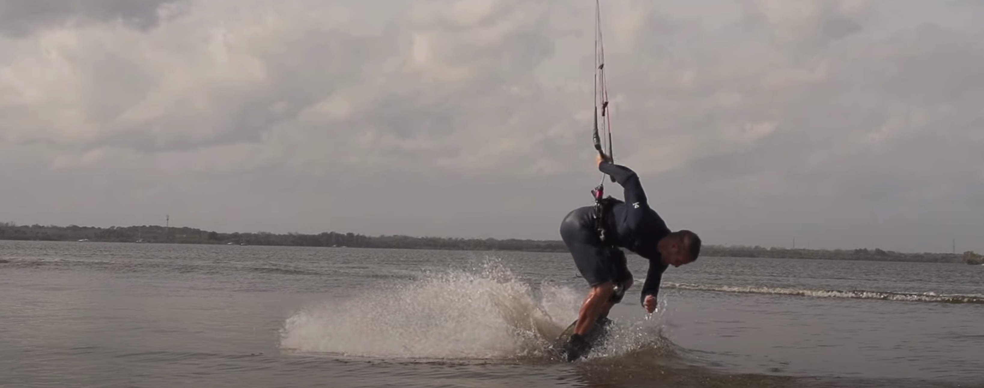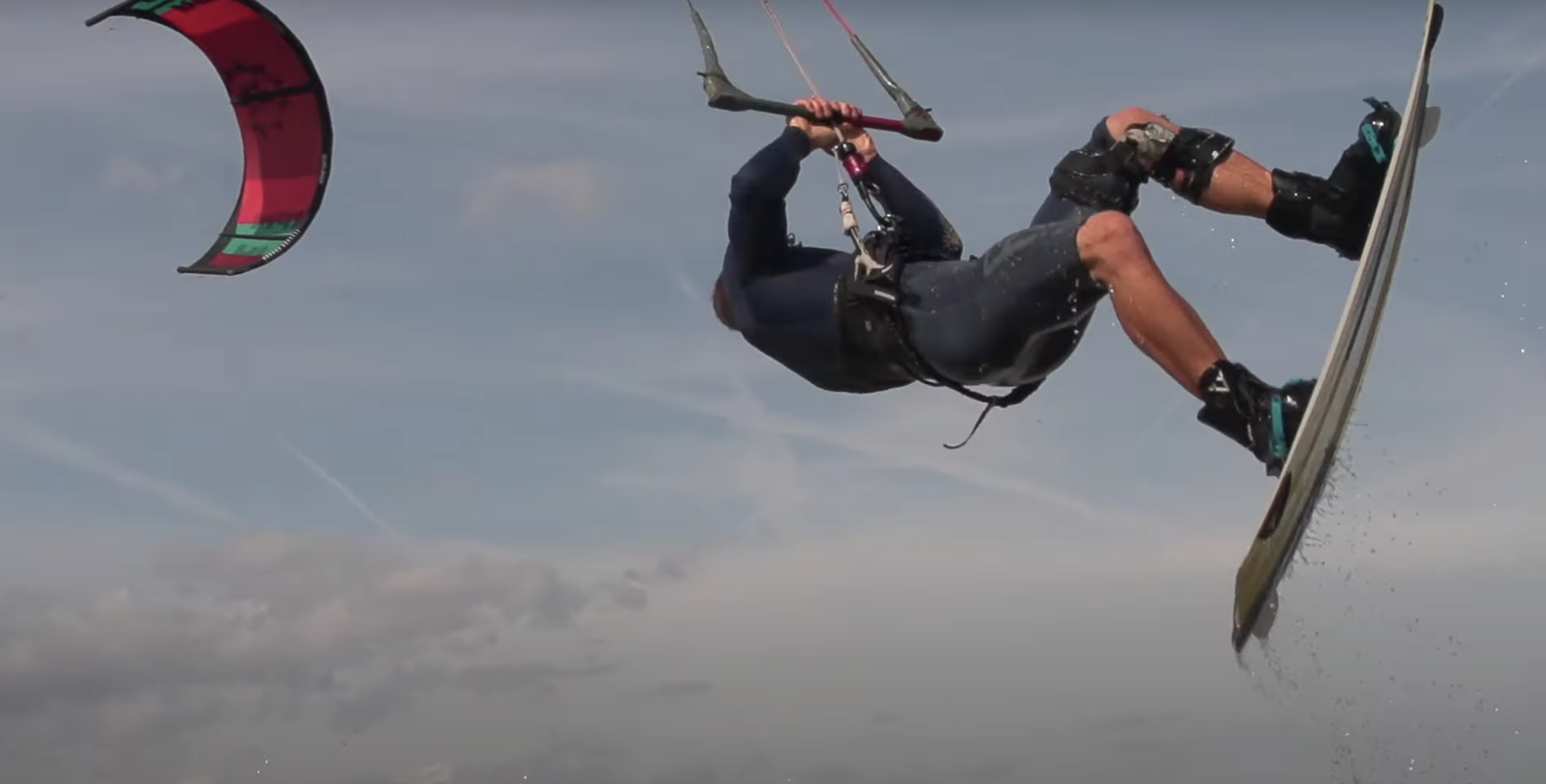 To land wrapped, you'll complete the backroll and be falling towards the water in the toeside position. To complete the rotation, swing your hips the extra 180 so you land on your heelside edge. The control bar will be wrapped behind you!