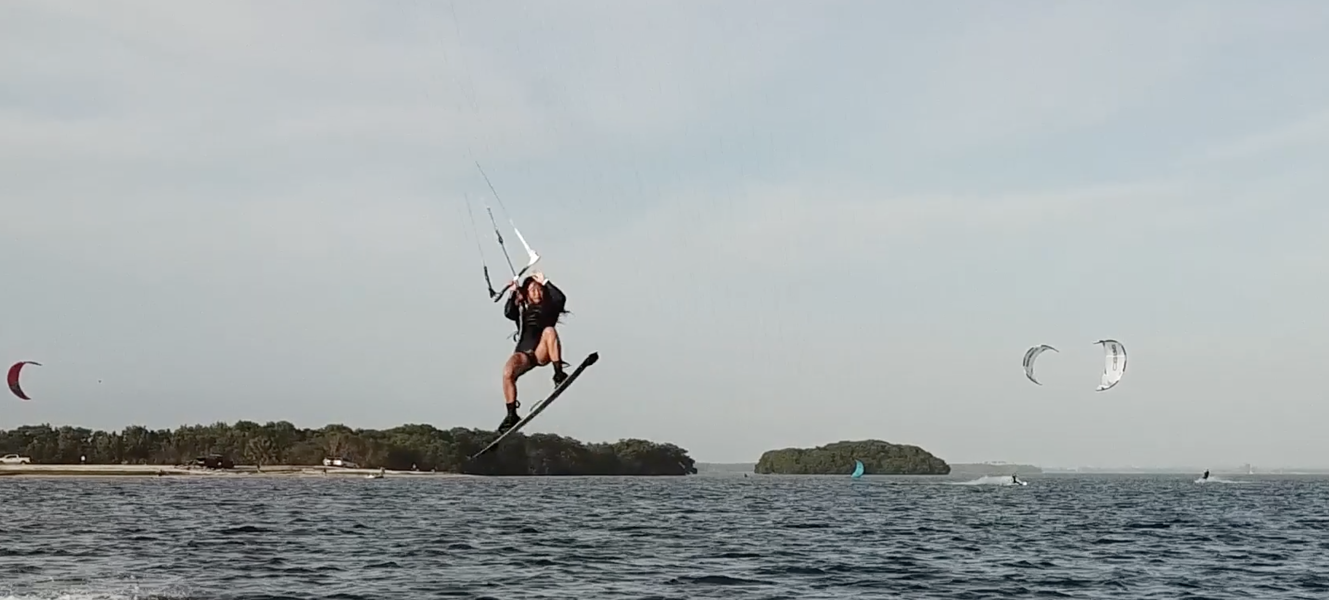 The Non-inverted Sent Hooked-in Front Roll Tail Grab is a super easy beginner trick. Keep your hands close to the middle of the bar and get some speed with the bar sheeted slightly out. Come in with good speed and send the kite up to noon. At the same time, sheet the bar in and pop off your back leg.