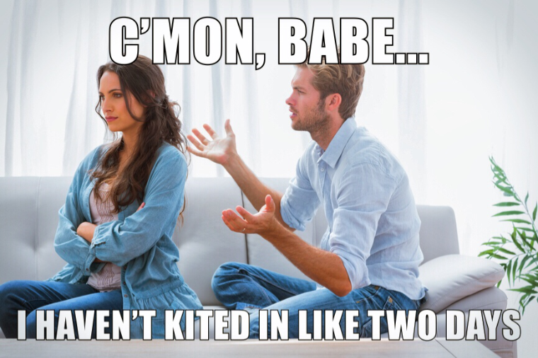 Sometimes it’s good to remind your significant other about the opportunities that you’ve missed because they’re probably not aware of it. Try putting frowny-face stickers on the fridge calendar for every day that you could have gone kiting. This will give a good visual clue to the non-winder about your current level of tweak and may glean an ounce or two of sympathy.