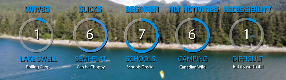 WHERE TO STAY: While there is a motel nearby for those that are traveling internationally and not equipped for camping, half the fun of kiting in this spot is camping! The Nitinaht Lake Campground has sites available for approximately $20CAD per night per vehicle. Campsites cannot be reserved, so it's first come first served. On a busy weekend, the campground can fill up quickly. Luckily, in this area sharing campsites is not only acceptable but also encouraged!