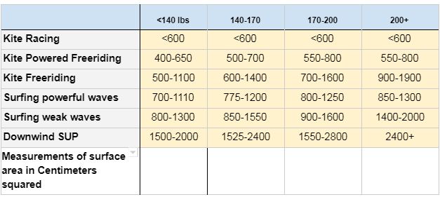 Foils designs are highly influenced by a number of variables, the most basic and important of which are surface area, aspect ratio, and chord thickness. As you might expect, foils with larger surface area provide more lift. Slower riding speeds or heavier loads will require more lift to sustain flight and to remain stable. Small foils have less drag and friction, which gives them a much higher top speed. Because of this, downwind SUP foilers will prefer wings upwards of 1900 cmsq while kite racers prefer foils with under 600 cmsq. Those being the outliers, most wave and kite foilers will find their happy spot somewhere between 650 and 1600 cmsq, depending on their weight, riding speed, and riding style. Reference the chart below to get a good idea of which might be best for you.