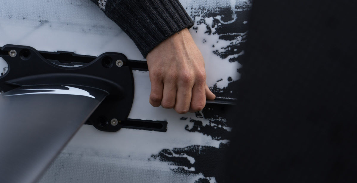 There's also an actual FCS2 fin box centered just forward of the track box. It's a clever solution to the drag a carry handle hole can create. Now your fin is your carry handle, and it adds almost no drag. In fact, the fin is optional; if you don't want it, you don't have to use it. But when you do have a fin in there while riding, it adds drive and directional stability while your board is in the water. In light winds or for new riders, this is a big help and keeps the board from feeling squirrely. It gives you something to push against to gain apparent wind and stay upwind. It's a feature that's unique to Omen and is a nice option to have.
