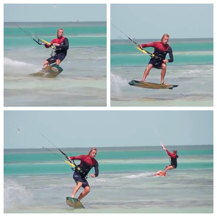 The key to not losing power while riding toeside is to not put too much weight your back foot. It’s can be awkward when you start riding like this and your weight distribution gets messed up. Be conscious that if you put too much weight on the back of your board it’s like you are pushing on the breaks. By applying a bit more front foot pressure it will allow you to keep the board on plane and not fight against the kite. Think of it as a boat going on plane. If everyone is sitting in the back of the boat it takes a while before the engine has enough power to get the boat moving. If you move some of the people forward then it evens out the weight distribution and allows for the engine to not work so hard and get moving right away. This same concept goes for riding a kiteboard and while we do weight the back foot more than the front there is a limit to how much before it becomes counter intuitive.
