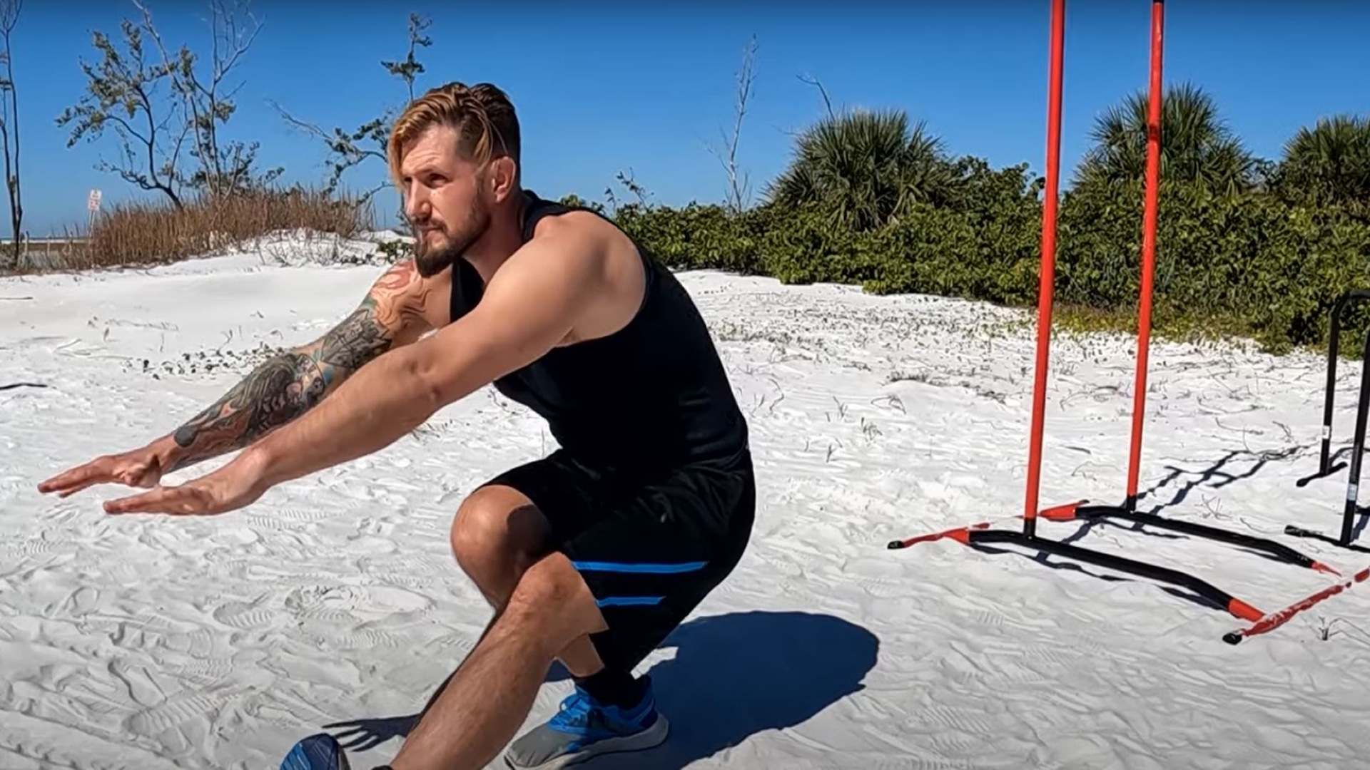 For your legs, this translates to your pop. It doesn't matter what your discipline is; you need to have strong legs so that you can pop off the water, and endurance is huge here. We've all had that session where you're out riding and your legs are just shot after a million jumps or kiteloops or whatever it is you're working on. Your core's shot, your legs are shot, your bum is shot. When you're doing all of these things, your core is pretty much always engaged in a calisthenic move. When you're doing squats, you can do bodyweight squats. Another move that I like to do is the Bulgarian split squat, or even just lunges. The Bulgarian split squat is where you put your leg up on a chair behind you and you do a single leg squat with the other leg. My personal favorite is the pistol squat, and this is more of a balance. I wouldn't say it's a party trick; I think some people would say it's debatable whether it's a super functional move, but I find it useful and I know Chris Bobryk finds this one extremely useful. Actually, that guy will jump onto a picnic table and land in a pistol squat! But again, you're strengthening your ligaments, your tendons, and you're getting better at balancing and being more aware of moving your body through space, and I think that's really huge. I will admit that I am a huge fan of weights when it comes to legs, and at home I actually had a squat rack set up, and even down here in Florida we have a membership for a gym, although I work outside probably 80 percent of the time. But I do like to get into the gym and just push some heavier weight because it is a little bit harder to progress on your legs. You can definitely do it, but once you're knocking out single leg squats for high reps, it feels good to start pushing some heavier weights.