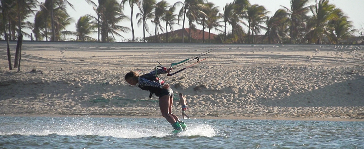 Treat your body as a unit. If you have ever practiced a board sport, you know to keep your shoulders, hips and knees in line with your tip and tail. Keep a strong upright posture and focus on what you feel. Feel the shift of balance as you shift the weight from heelside to toeside and vice versa. Feel the pull of the kite as you ride downwind. Be mindful of the control bar as you rotate your hand into the small of your back. Make sure you look where you are going. The body follows your head and line of sight.