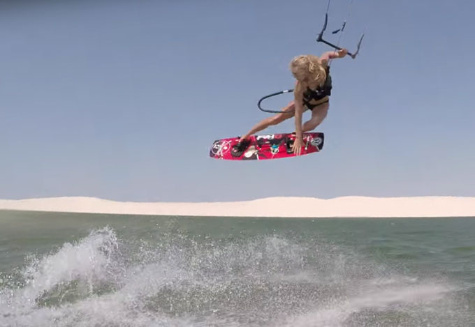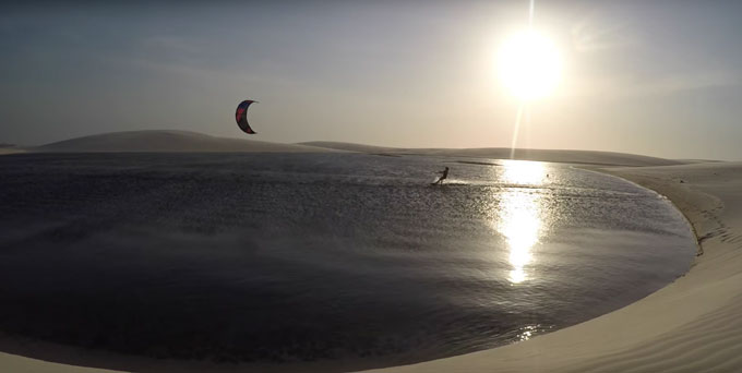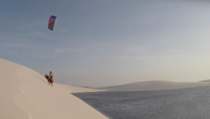 Check out professional kiteboarder, Hannah Whiteley, as she rides the lagoons of the Brazilian Dunes, located in Northern Brazil. This area is referred to as the "Bedsheets" due to the endless, while dunes that appear to roll like bed sheets, as seen from above. There are numerous crescent shaped dunes formed by winds, and lagoons filled with rainwater. You could probably go pool-hopping for a week, without hitting the same spot twice.
