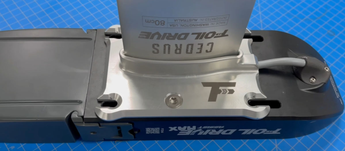 The top plate of the Cedrus mast has a couple bolt holes you can tap through to keep your Foil Drive unit attached to the mast. Between that and the toolless CWS track bolts, setup is simple and fast at the beach.