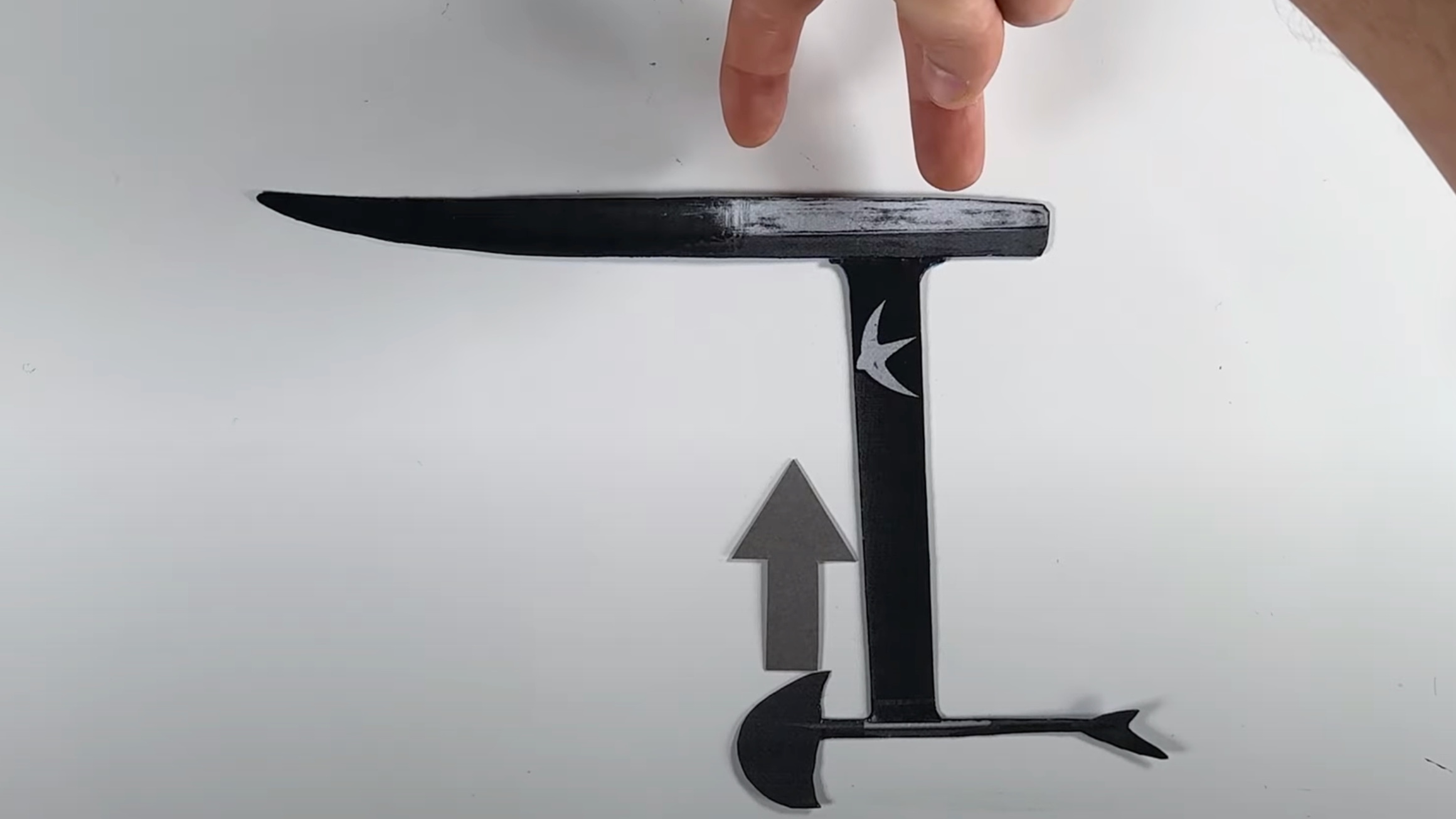- Lift from the foil: Acting upward from the wing’s center of lift.